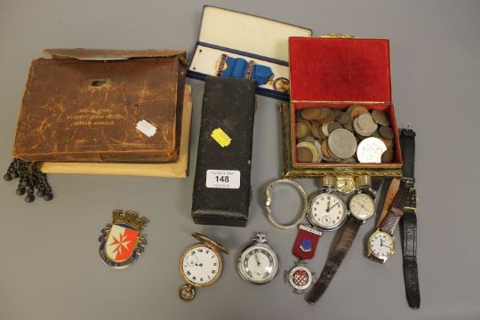 A box containing Ingersoll Triumph pocket watch, Roamer wristwatch, other watches, Lodge medals and ephemera, set of dominoes, box of coins etc (Q)