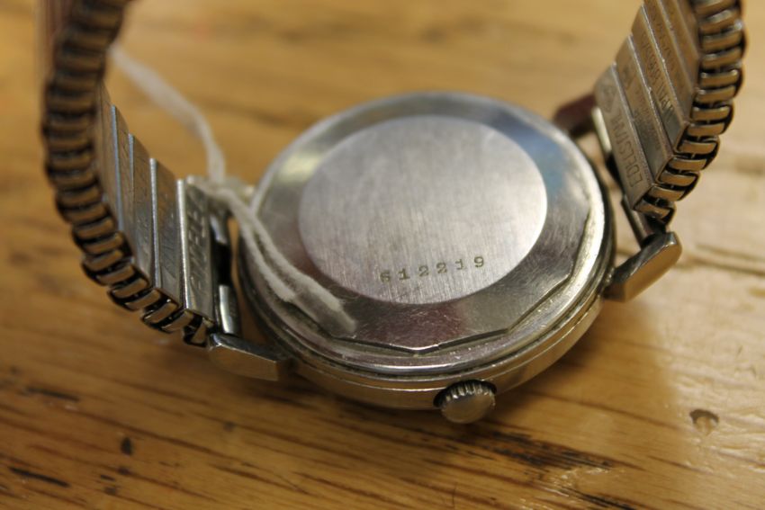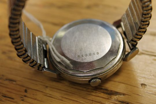 The bracelet is later. The case, glass and bracelet have typical surface scratches. Dial discoloured. The watch winds, runs and adjusts but the power reserve indicator does not seem to be moving, it is stuck at 40hrs. There is no inscription to the case back. Case back stamped 612219 Movement needs cleaning. See additional images.