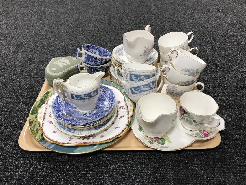 A tray of nineteen pieces of Colclough china, Coalport Reverley china, Doulton four corners collector's plates, Wedgwood trinket box etc