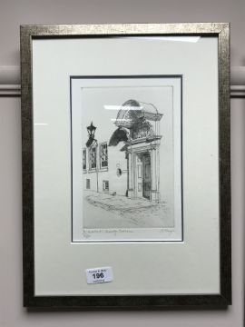 An etching depicting St. Cuthbert's Society, Durham, 13.5 cm x 20 cm, limited edition and signed in pencil, framed.