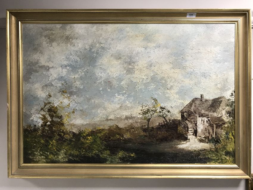 Twentieth century school : Study of a watermill, oil on board, 59 cm x 89 cm, framed.