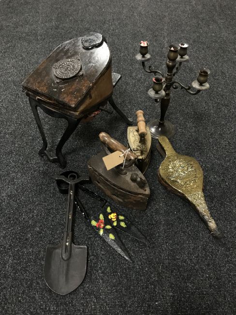 A vintage Fletcher Russell bellows, set of vintage irons, candelabra etc