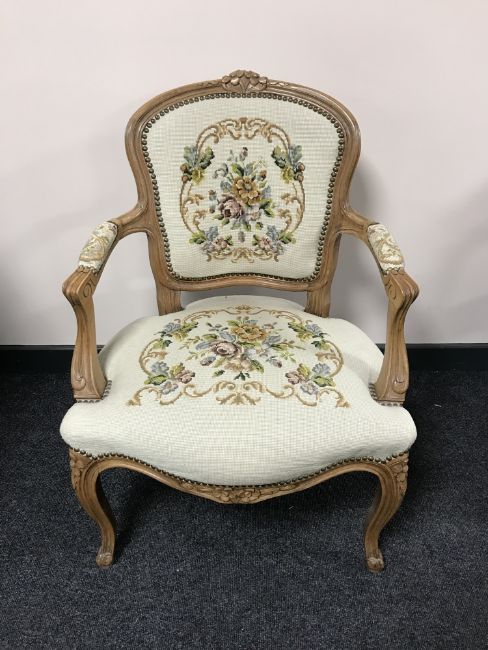 A pair of carved walnut framed armchairs