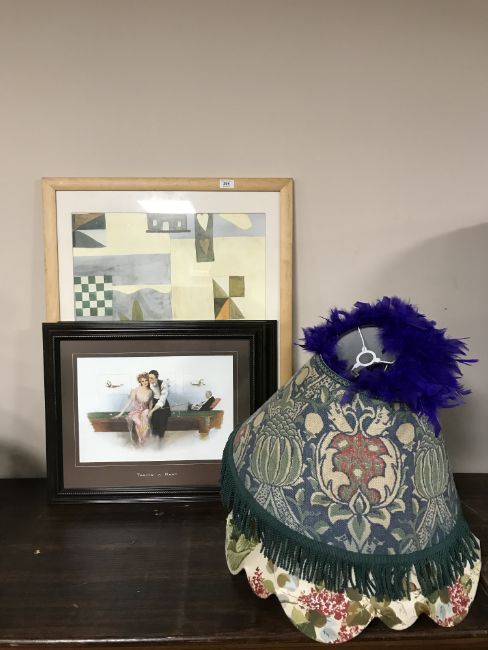 A pair of Hal Hurst framed prints - Leaving and Taking a rest, together with a beech framed print, two standard lamp shades and a table lamp shade.