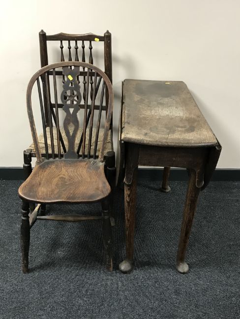 A George III oak gate leg table on pad feet, width 100 cm, together with a rush seated country chair and a single Windsor chair of the same period. (3)