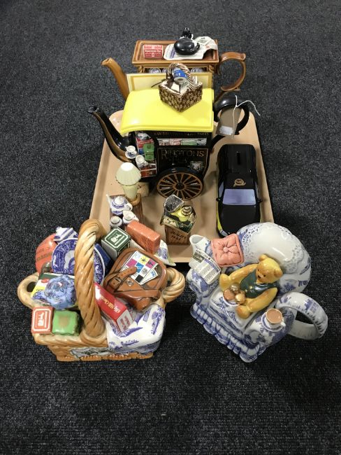A tray of four Ringtons novelty teapots, together with a Ringtons delivery van money box