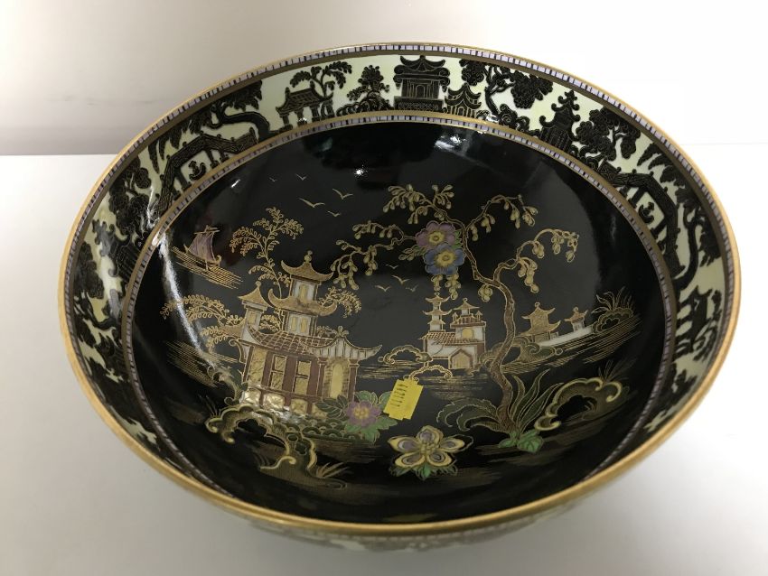 A Maling oriental style black and gilt fruit bowl pattern 3585, width 26 cm.