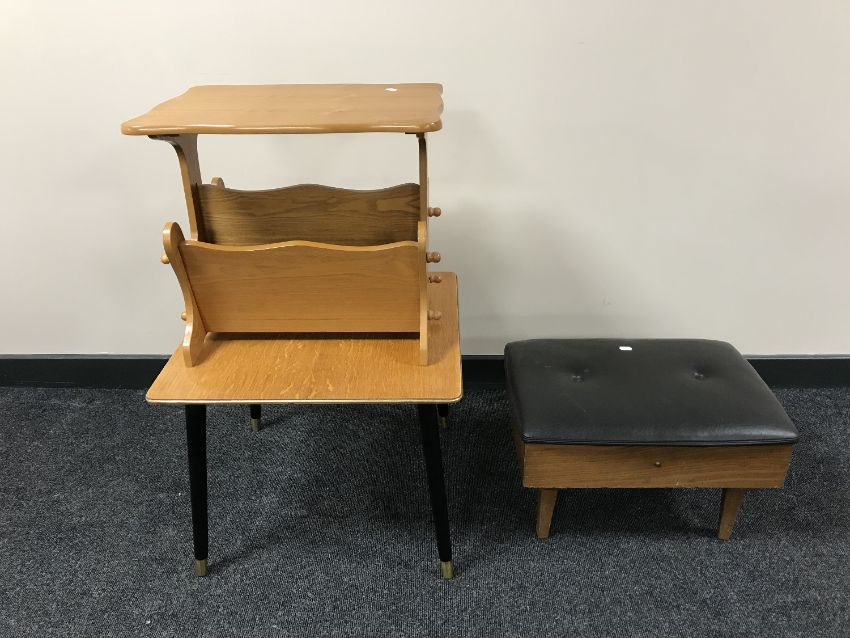 A 1970's teak square coffee table, teak storage sewing box and a mag rack