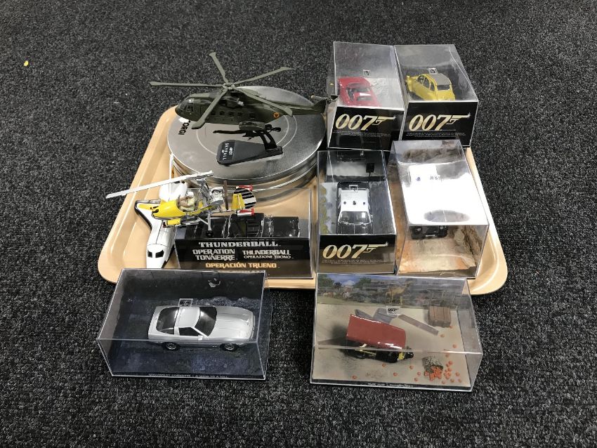 A tray of nine James Bond die cast vehicles in plastic display cases together with a James Bond Thunderbird microglider and a Sky Fall helicopter, James Bond Corgi Casino Royal die cast car and card set in case together with a die cast Moonraker space shuttle (13)
