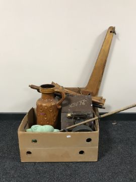 A box of West German jug, hickory shafted golf club, shoe shine kit, vintage chair frame etc.