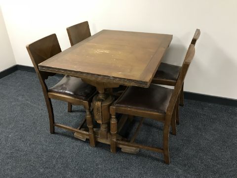 The table measures 107cm long, 76cm wide and 75cm high when closed. When extended this adds 60cm in length. The chairs are 84cm higfh and 47cm wide.