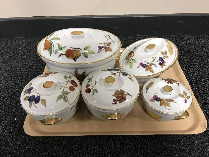 A tray of six Royal Worcester lidded oven dishes together with two Evesham soufle dishes