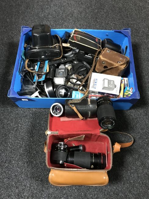 Three boxes of camera equipment including 35m camera and lenses, flash guns etc