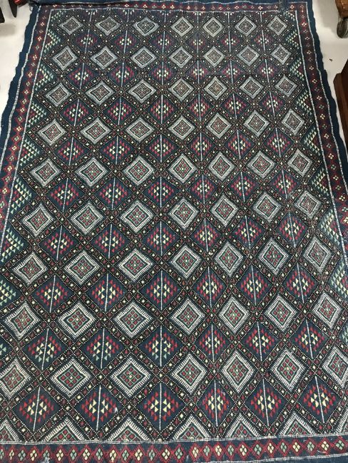 A fringed woollen Turkish rug of geometric design on blue ground