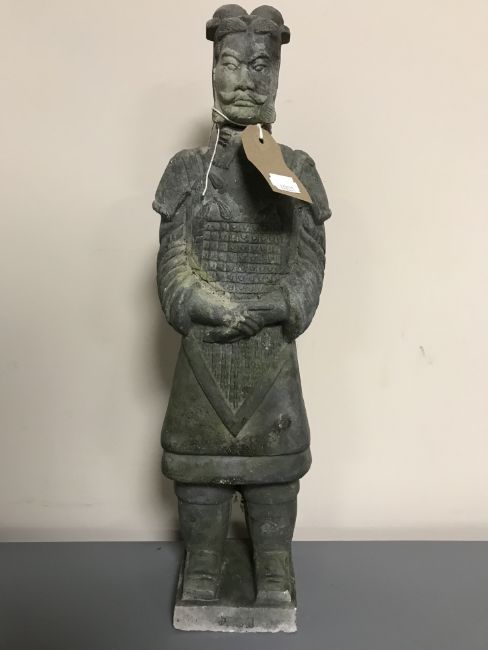A box of oriental style tea china, together with two brass bound table boxes, brass teapots, terracotta army figure etc