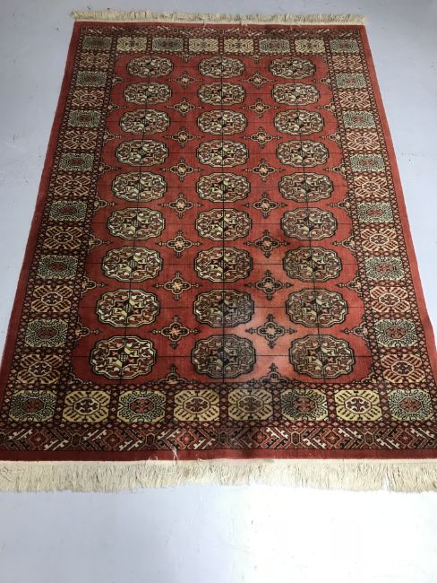 A red fringed woollen rug and a pink floral patterned rug
