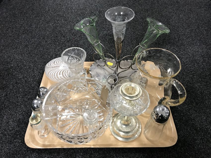 A tray of plated four-way epergne with three glass flutes, hand blown glass moon flask, cruet set etc