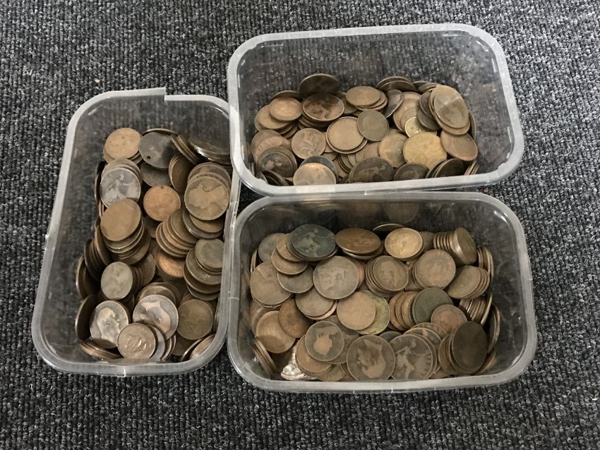 Three tubs of Victorian, Georgian and Queen Elizabeth pennies and half pennies