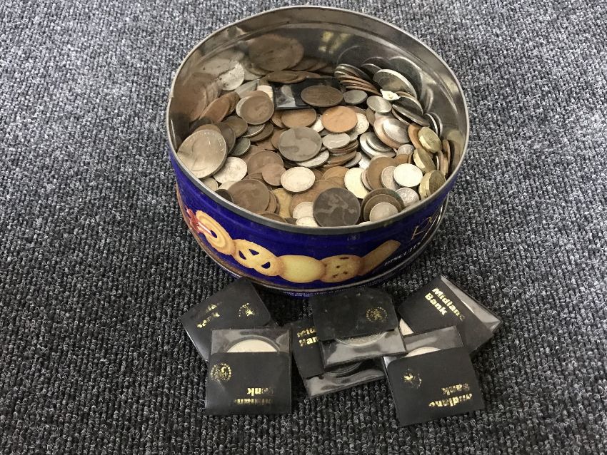 A tin of pre decimal British coins, Churchill crown etc