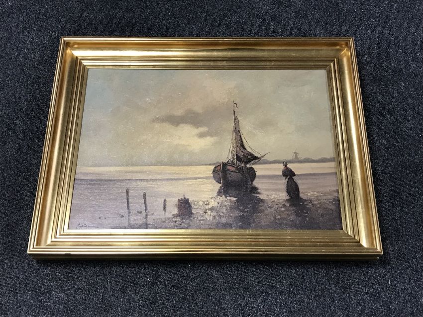 A gilt framed continental oil on canvas - figure at shoreline indistinctly signed