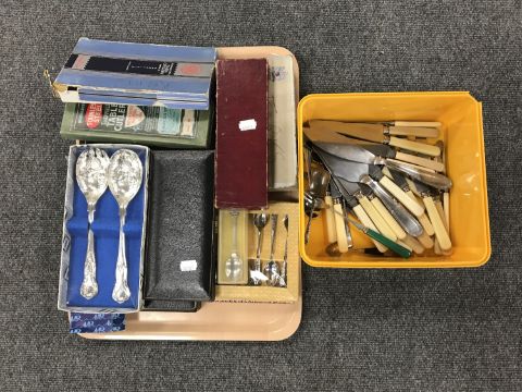 A tray of assorted unboxed and boxed table cutlery, teaspoons, servers etc