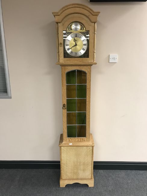 A blond oak Tempus Fugit longcase clock with pendulum and weights