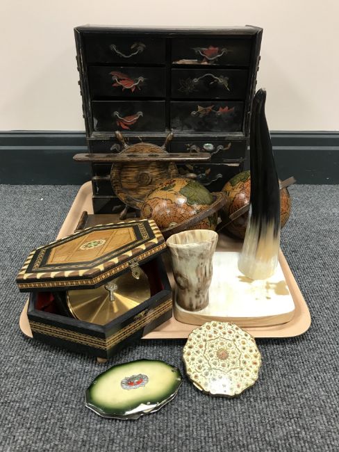 An oriental black lacquered miniature chest, pair of wooden globes, inlaid trinket box, compact, pipe rack etc