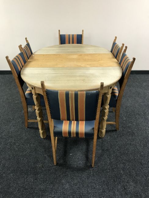 A blond oak circular extending dining table with leaf, together with six chairs upholstered in a blue striped fabric