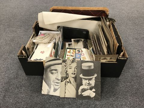 A box of assorted ephemera, poster cards, postcards, greetings card, scrap album etc