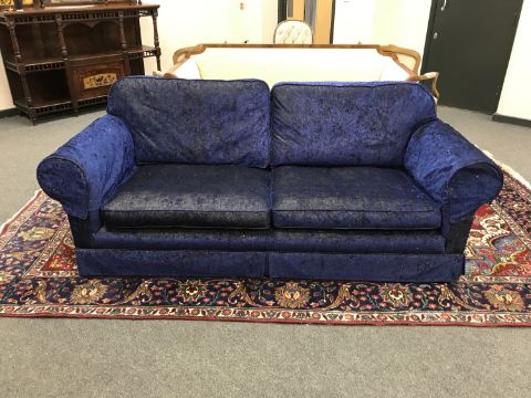 A Delcor three seater settee upholstered in crushed blue velvet encrusted with diamond-effect studs, width 220 cm.