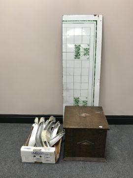 A mid-20th century enamelled splash back together with a copper coal receiver and liner and a box containing metal door handles