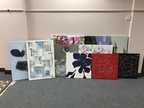 Nine assorted wall canvases - portrait of a cow by Amelia Rose, etc