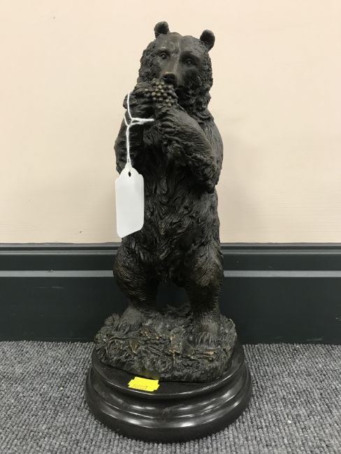 A bronze figure of a bear standing on hind legs, on plinth.