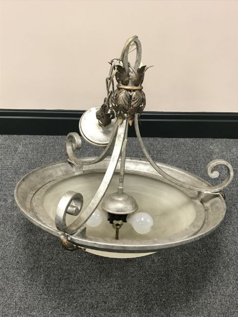 A decorative metal ceiling light with opaque glass shade