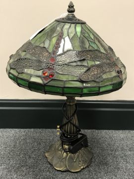 A Tiffany style table lamp and shade with dragonfly decoration