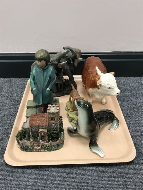A china figure of a Hereford bull, together with a contemporary figure of an elephant family, a Piazza figure 'Growing Up' etc