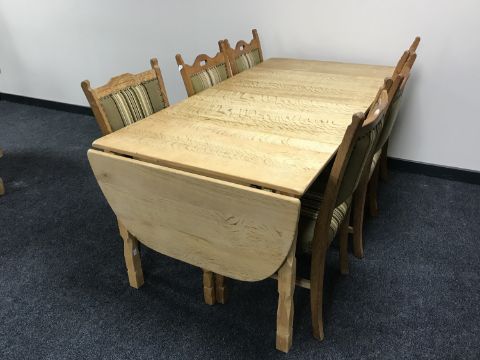 A blond oak extending drop end dining table with leaves, together with six chairs upholstered in a green striped fabric