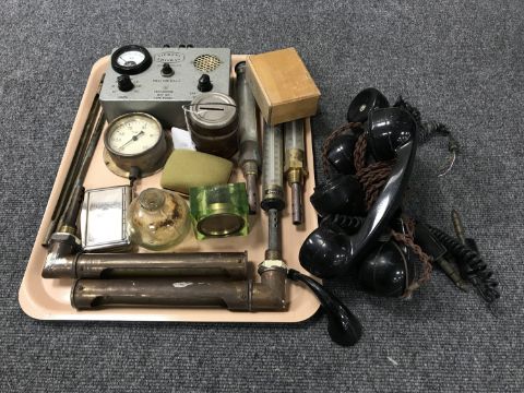 A tray of Siemens Ediswan Transistor Tes Set, brass gauge, cigarette box, mid twentieth century desk clock, copper cased thermometer etc