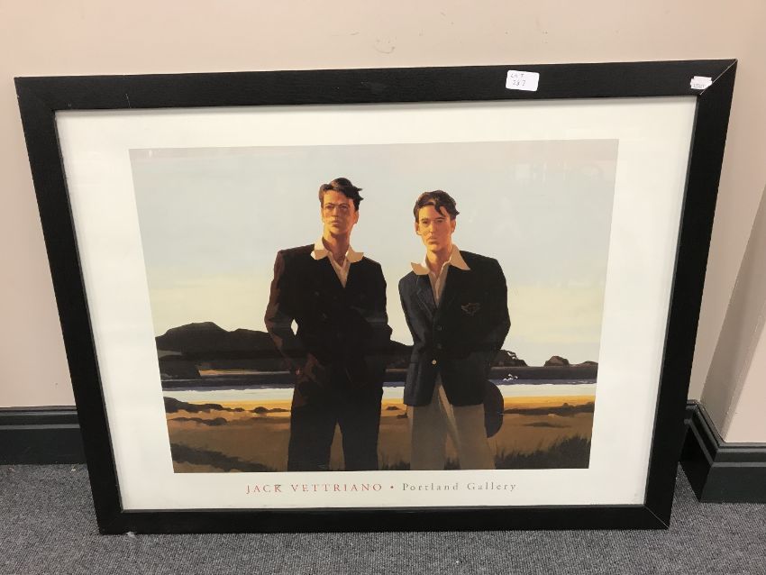 Two gilt framed oils on canvas - band in hot air balloons, one other by the same artist and a Vettriano print