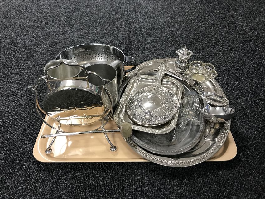 A tray of silver plated ware, gong & beater, hand mirror, serving tray, spoons, miniature comports, tankards etc