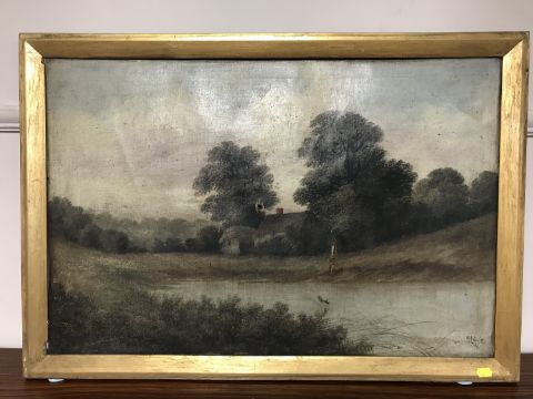 Blake (nineteenth century school) : A pair of gilt framed oils on canvas depicting cottages by a river, both parts signed, framed. (2)