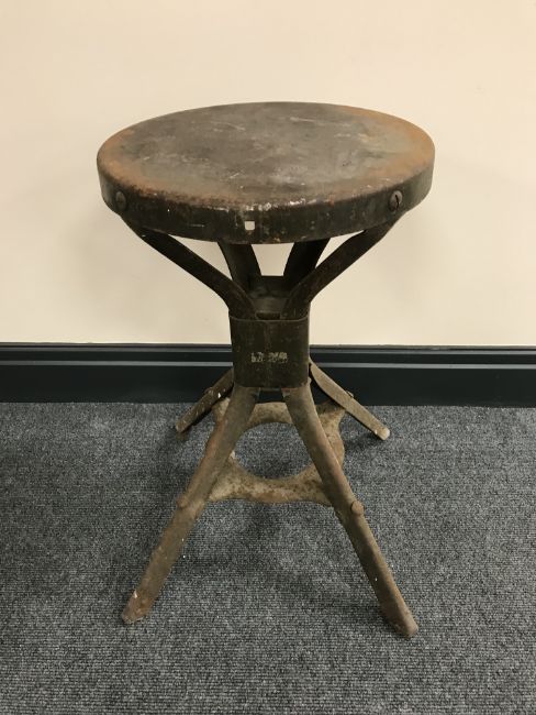 A mid-20th century circular Evertaut industrial stool on four legs