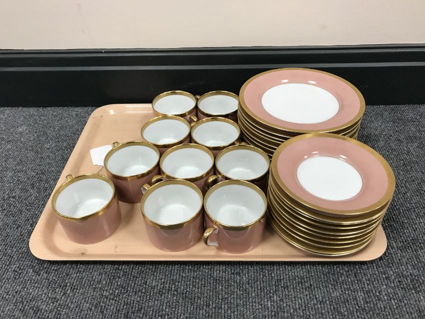 A tray containing thirty pieces of Fitz and Floyd Versailles Dusty Rose tea china
