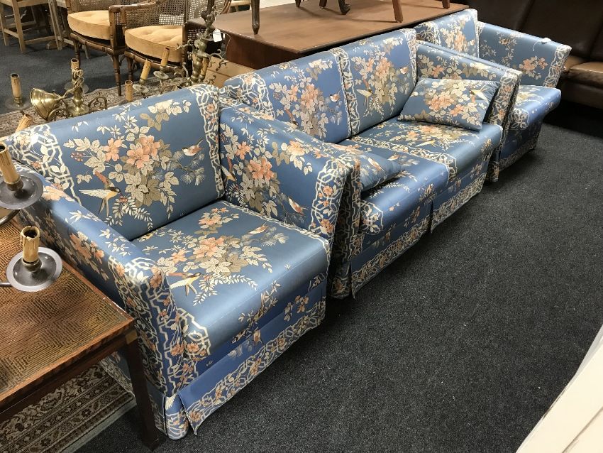 A three piece lounge suite upholstered in blue floral print depicting birds
