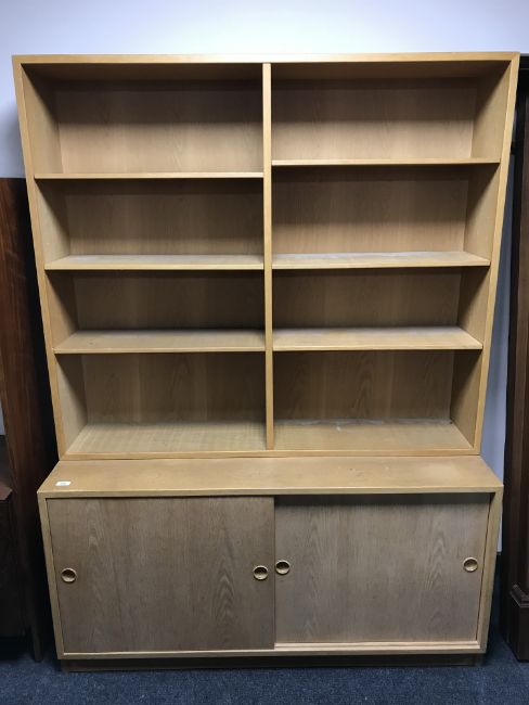 A late 20th century set of teak shelves fitted with cupboards below