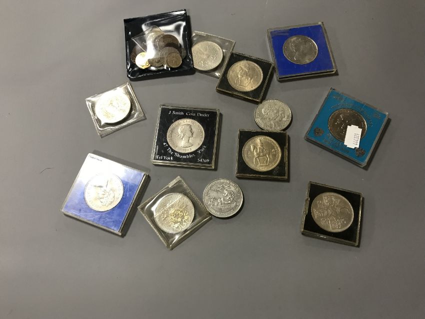 A quantity of assorted crowns, Guernsey £5 coin, Foreign coins etc