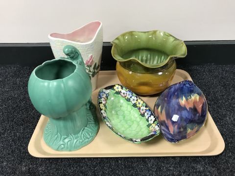 A tray of Bretby glazed planter, three pieces of Maling china, Sylvac gnome vase