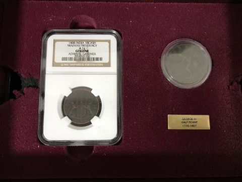 A tray of Danbury Mint sunken treasure from the reign of George III coins in chest together with Atlas pocket watches, boxed Hadson lighters, Crowns, £5 coin etc