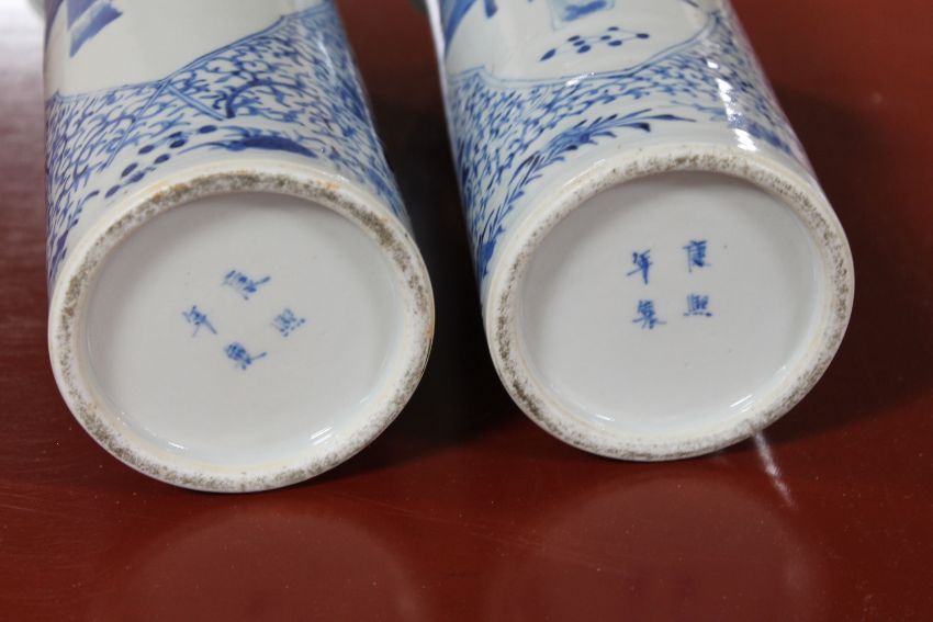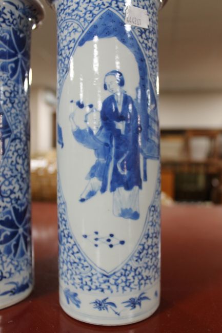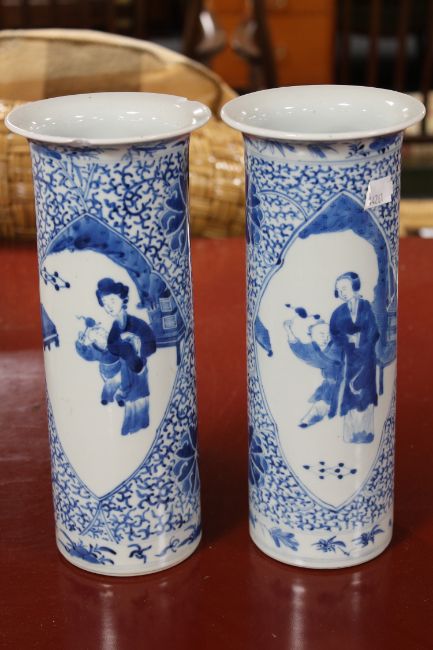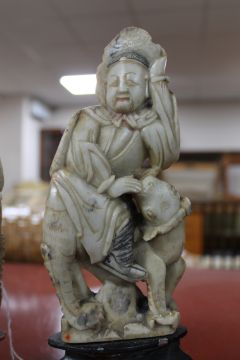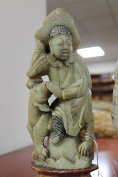 Soapstone figures with chips and losses. Bases cracked and reglued in places. One of the vases with two chips to the rim. Vases 26cm high. See additional images.