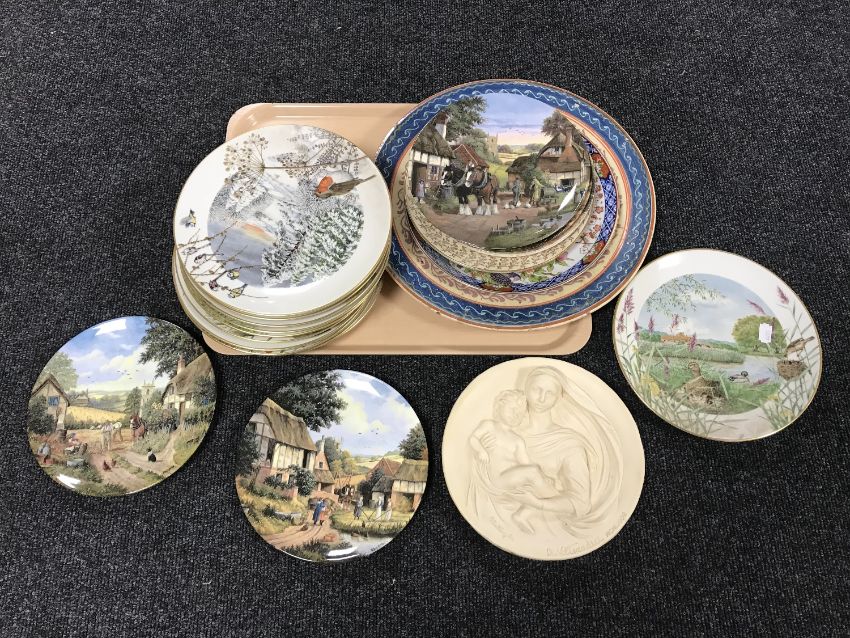 A tray of collector's plates, religious wall plaques, set of twelve Royal Worcester Peter Barett plates depicting English country scenes